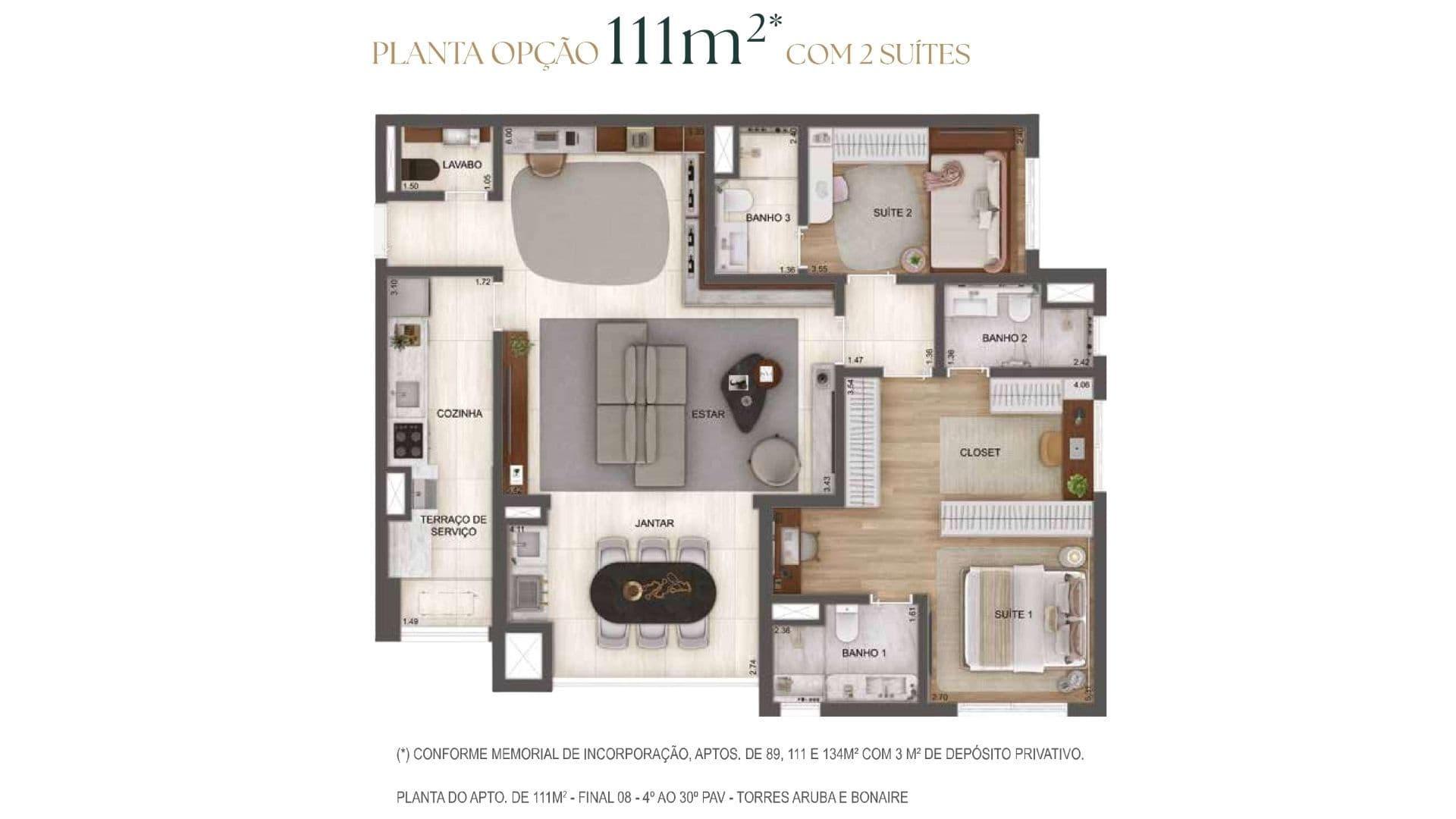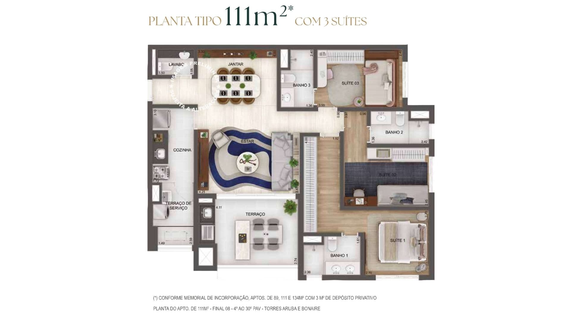 - 111 m²: 2 ou 3 suítes, com depósito e 2 vagas