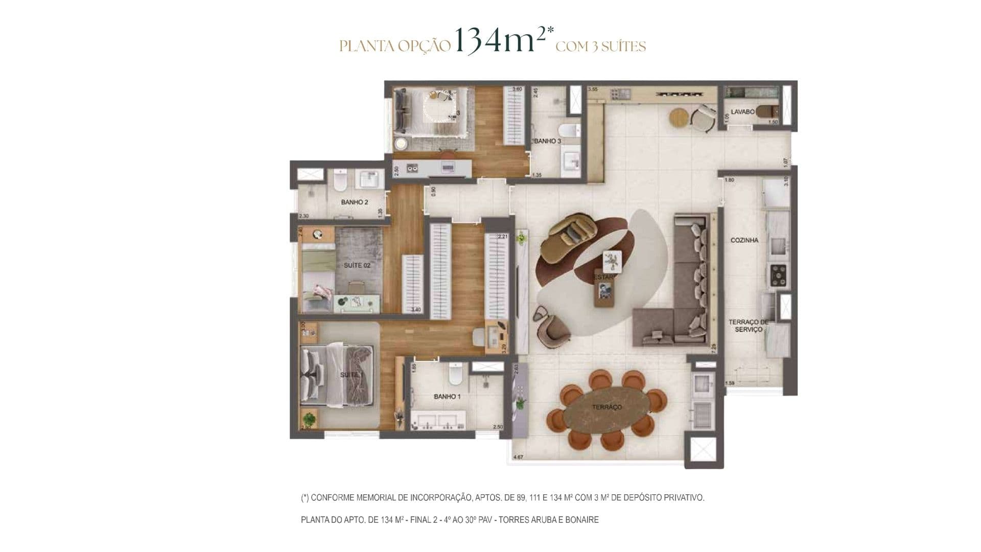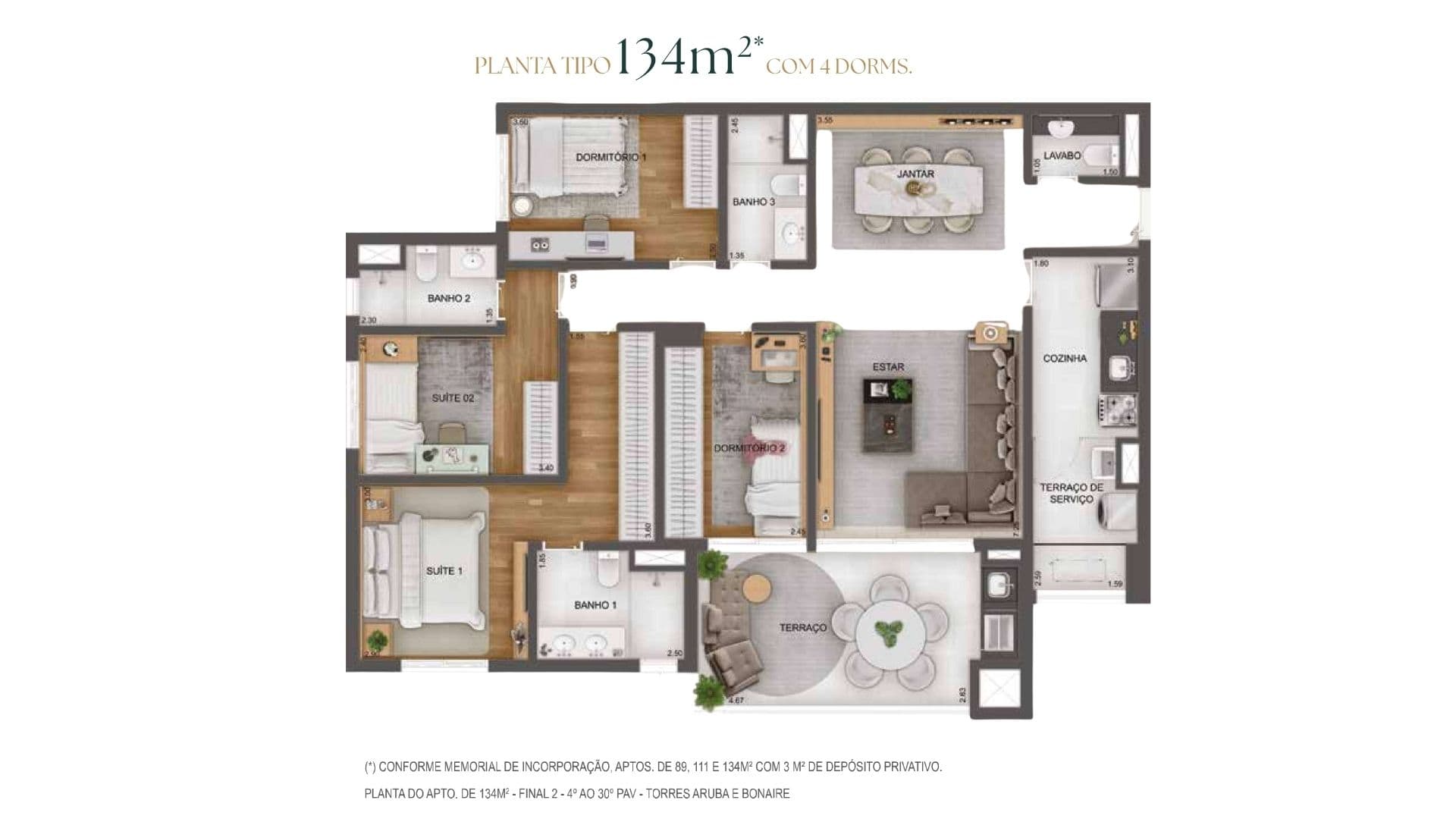 - 134 m²: 3 suítes ou 4 dormitórios, com depósito e 2 vagas