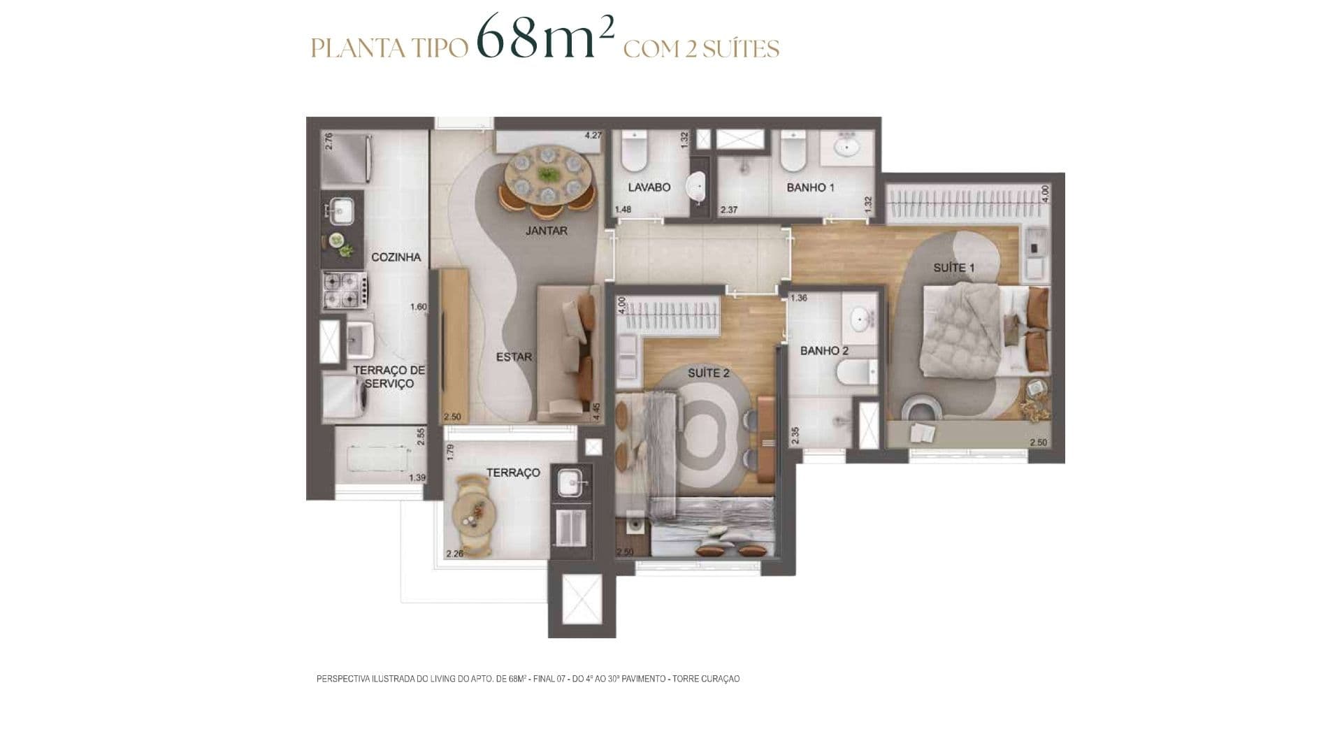 - 68 m²: 2 suítes com 1 vaga de veículo