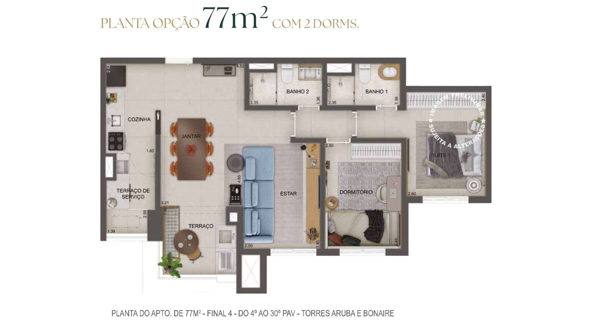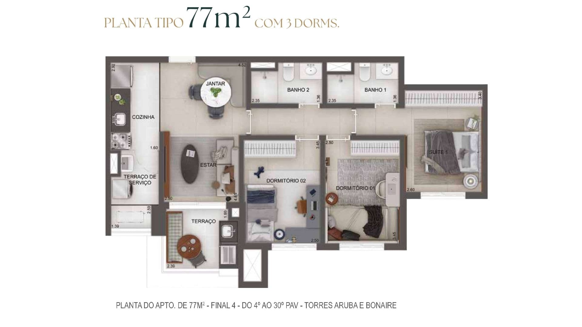- 77 m²: opção de 2 ou 3 dormitórios, com 1 vaga