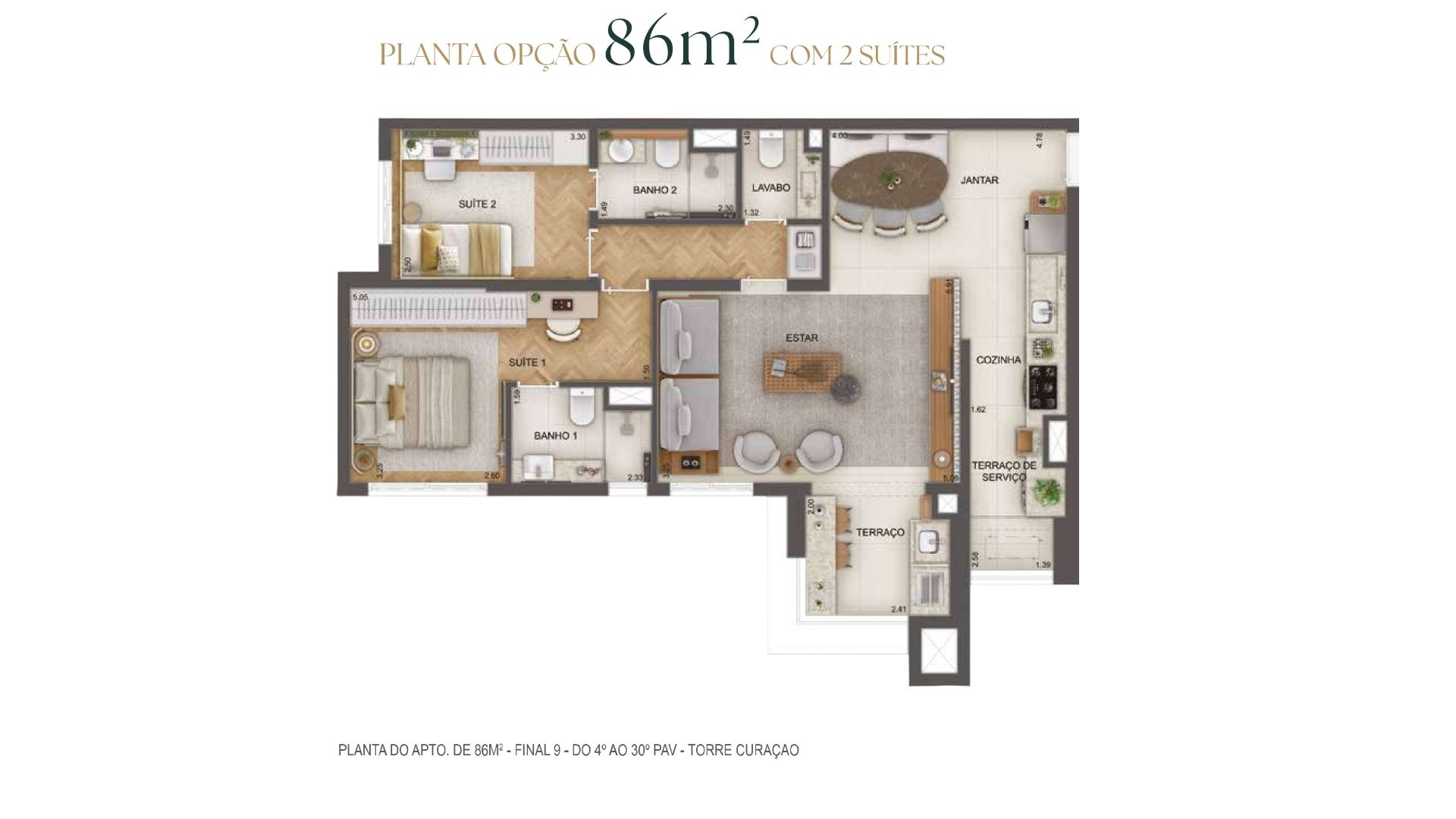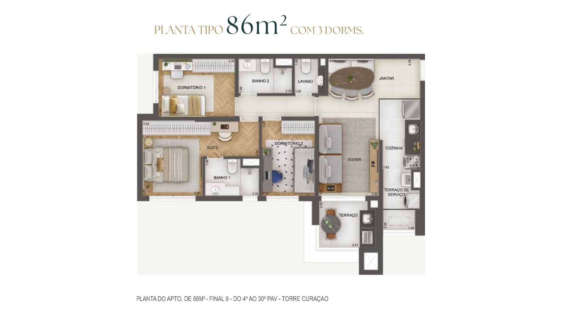 - 86 m²: 2 suítes ou 3 dormitórios, com depósito e 2 vagas