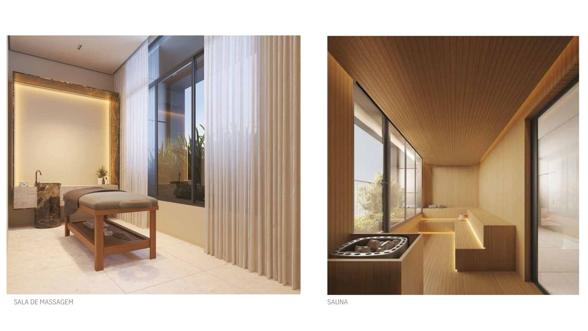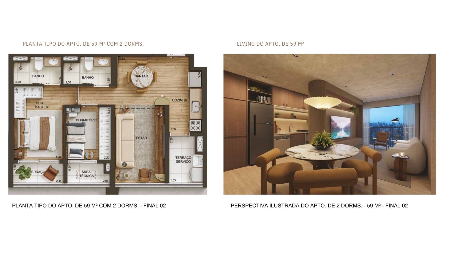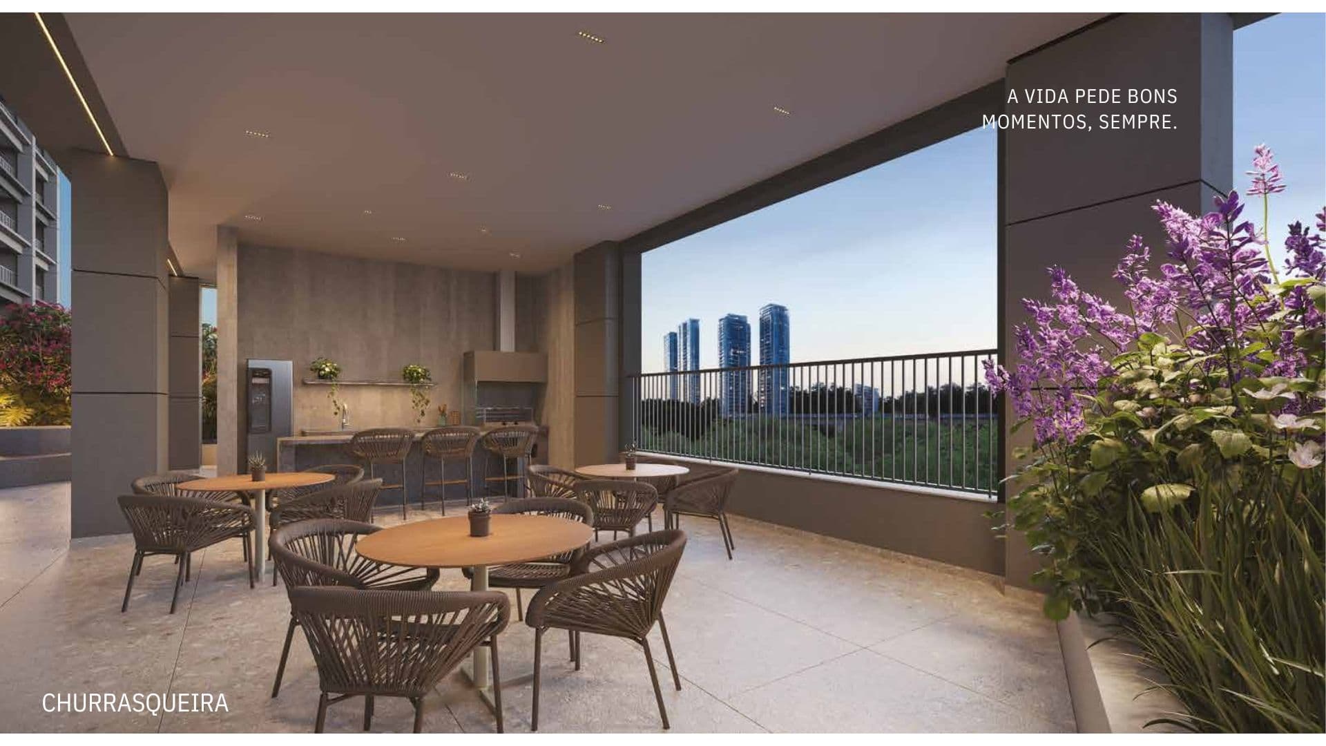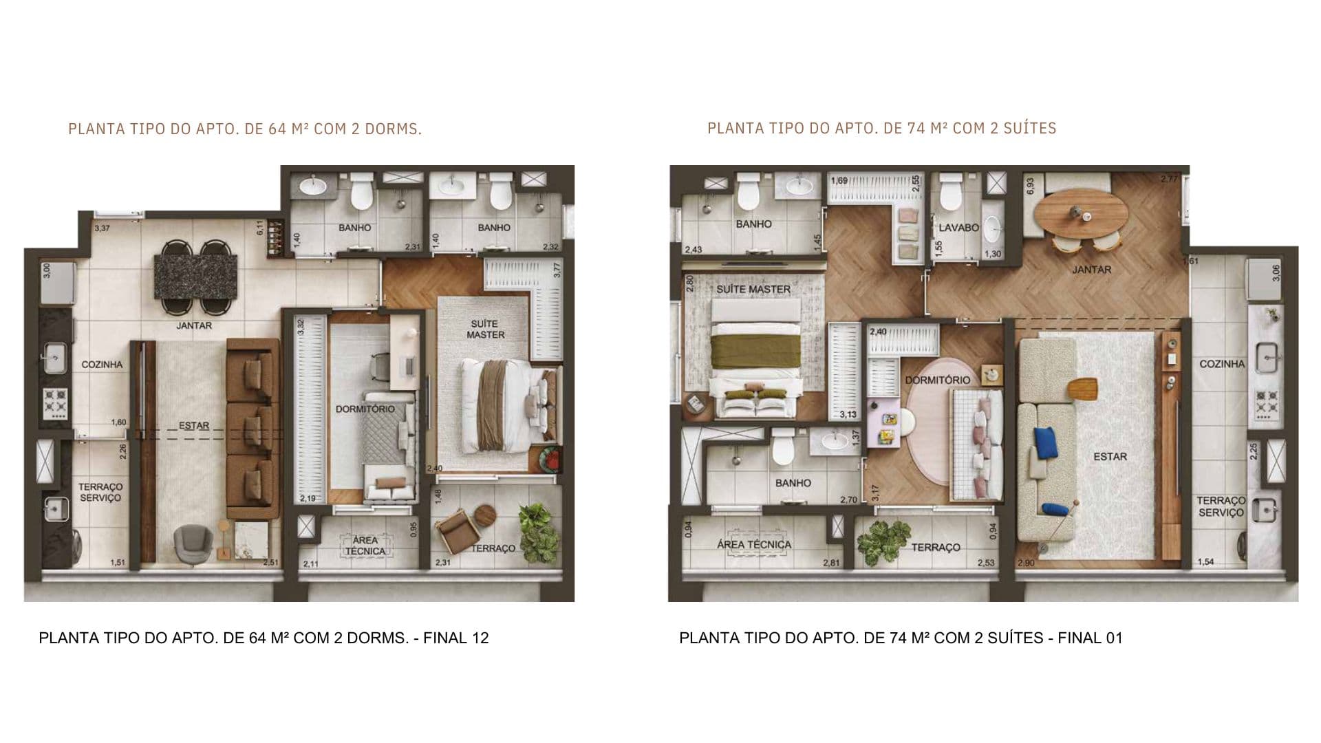 Também conta com apartamentos de 2 dormitórios de 59 m² e 64 m², além de unidades de 74 m² com duas suítes, com opção de uma vaga.