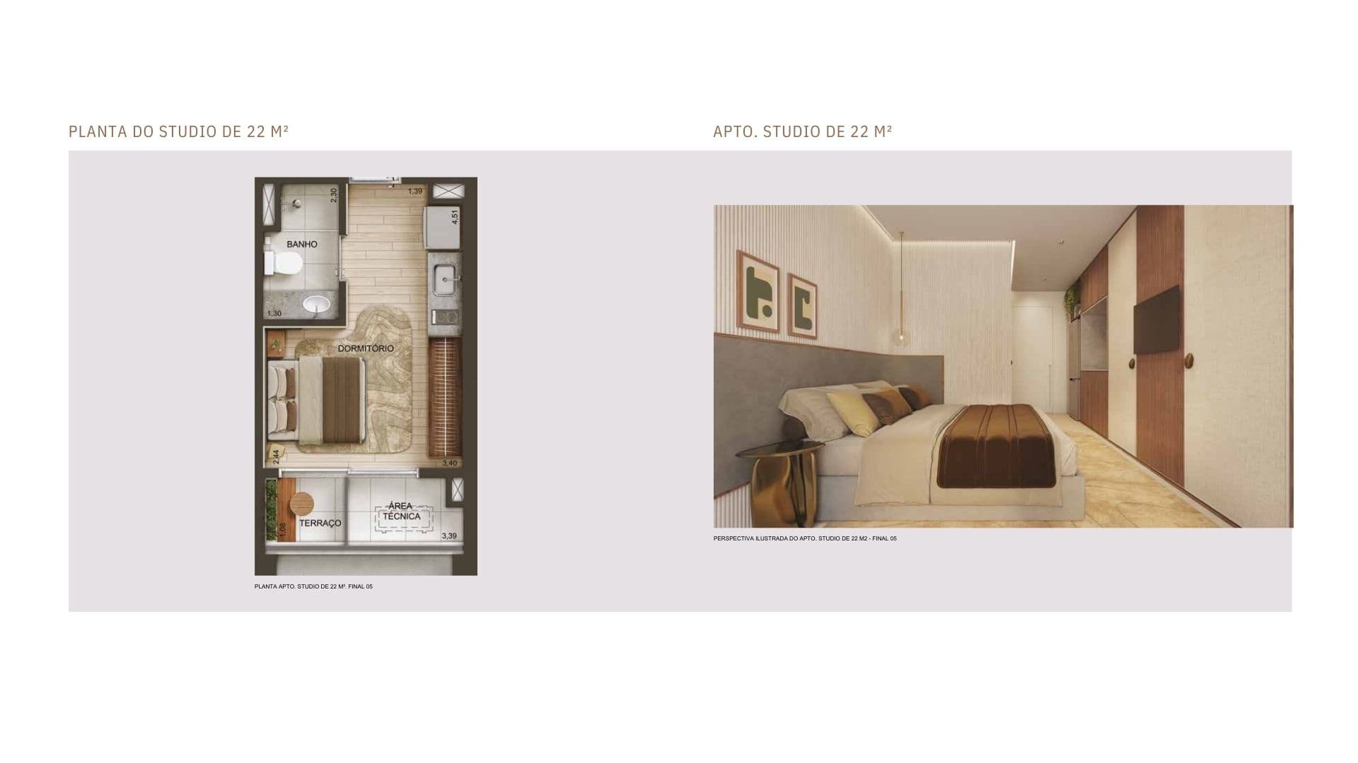 O projeto oferece studios de 22 m² e apartamentos de 1 dormitório com 31 m², com opção de vaga, ideais para quem busca praticidade e investimento voltado para locação.